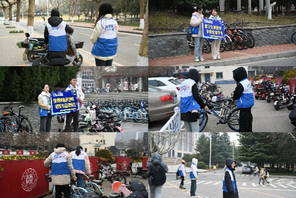 在校园交通治理志愿活动中,志愿者们身穿醒目的志愿者服装,在校园的各个主要路口协助指挥交通,并将校园内自行车、电动车统一摆放,同时还引导同学们维护校园交通秩序,确保行车安全,做到文明通行。校园中一抹抹“国际蓝”,展现了商院学子坚定做雷锋精神传人,争当志愿服务践行者的良好风貌。