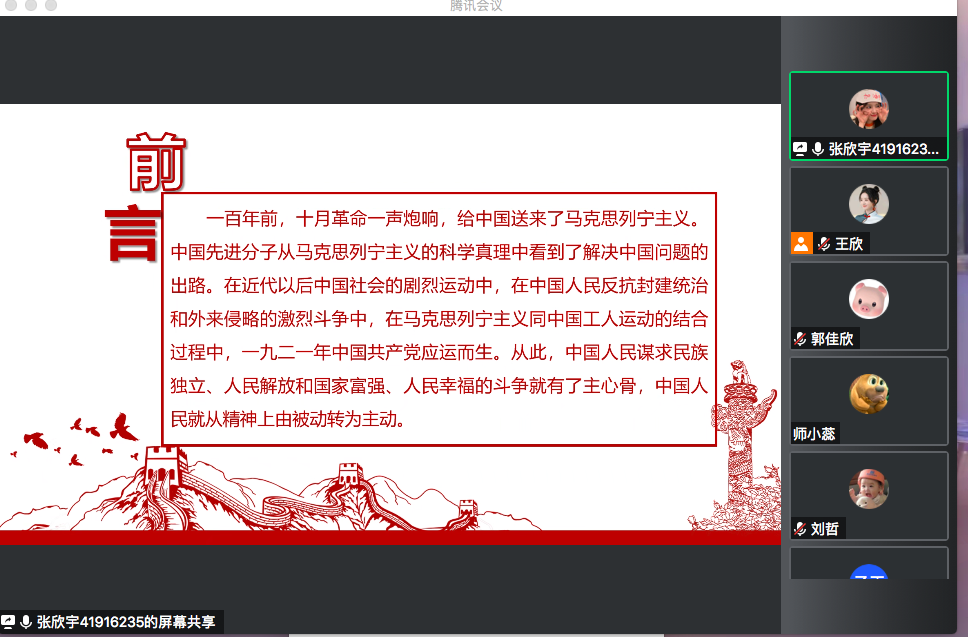 首先,张欣宇同志领学习近平总书记重要文章《新时代中国共产党的历史使命》,提出重点把握中国共产党在百年奋斗历史经验中为实现中华民族伟大复兴的三个深刻认识、三个“必须”以及“四个伟大”,强调在日常生活学习中要更好把握和运用党的百年奋斗历史经验并且更加明确中国共产党员的初心与使命。