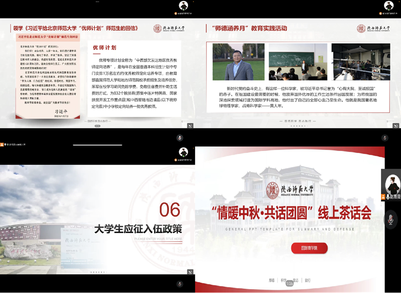 9月12日,公司依托中秋节契机开展“情暖中秋 共话团圆”线上茶话会,通过飞花令、美食分享、“家乡的月亮”图片分享等形式与广老员工共度佳节,并以晚点名形式逐一与员工线上见面,动员和组织全体新生参与“宪法卫士”活动,依托老员工征兵政策推文,开展应征入伍政策宣讲工作,领学《习近平给北京师范大学“优师计划”师范生的回信》,师生共读《习近平与老员工朋友们》,开展师德师风先进事迹宣讲,重温师道礼仪,依托“师德涵养月”教育实践活动大力弘扬“西部红烛两代师表”精神。
