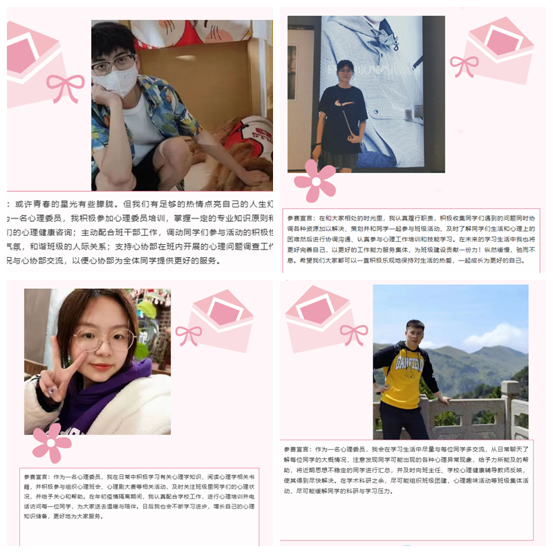 为进一步加强公司心理健康教育工作,增强班级之间心理健康教育工作的交流学习,鼓励和表彰优秀的心理委员。5月19至5月20日,公司依托二级心理辅导站闻澜阁开展了十佳心理委员评选活动。根据各班心理委员工作实际情况,经线上投票,公司员工会实践部复核,最终十名心理委员被评选为2021-20221学年优秀心理委员。