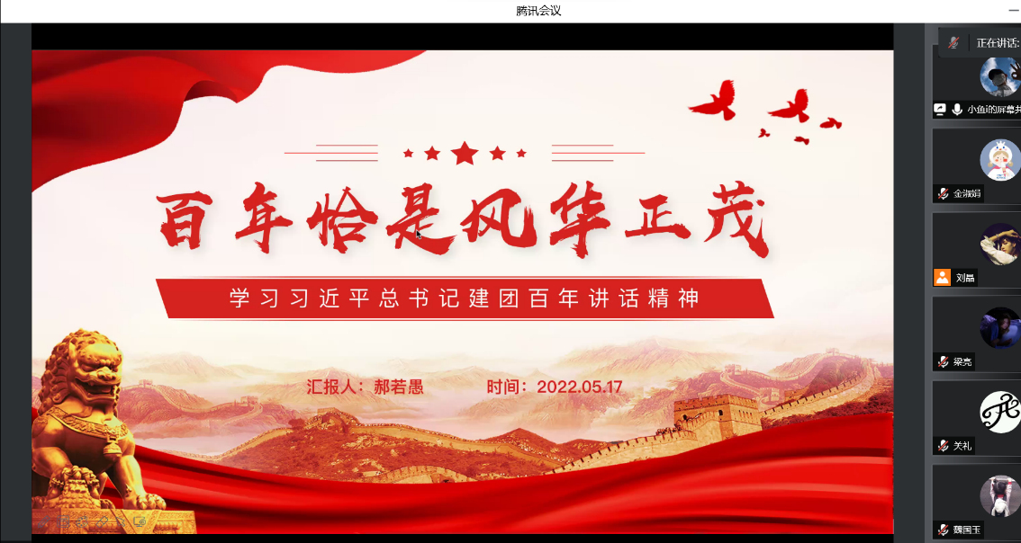 会上,王昱博、郝若愚两位同志带领大家学习了习近平总书记在庆祝中国共产主义青年团成立100周年大会上的讲话。在讲话中,习近平总书记提出新时代的广大共青团员,要做理想远大、信念坚定的模范,要做刻苦学习、锐意创新的模范,要做敢于斗争、善于斗争的模范,要做艰苦奋斗、无私奉献的模范,要做崇德向善、严守纪律的模范。史一可、孙慧敏两位同志带领大家学习了习近平总书记在中国人民大学考察时的重要讲话精神。他们介绍到,在2022年五四青年节前夕,习近平总书记走进了中国人民大学考察,先后走进思政课智慧教室、博物馆、图书馆,了解公司促进思政课教育改革创新、公司历史沿革、教学科研成果、加强文献古籍保护利用和促进理论研究成果转化应用等情况,并主持召开师生代表座谈会,发表重要讲话。