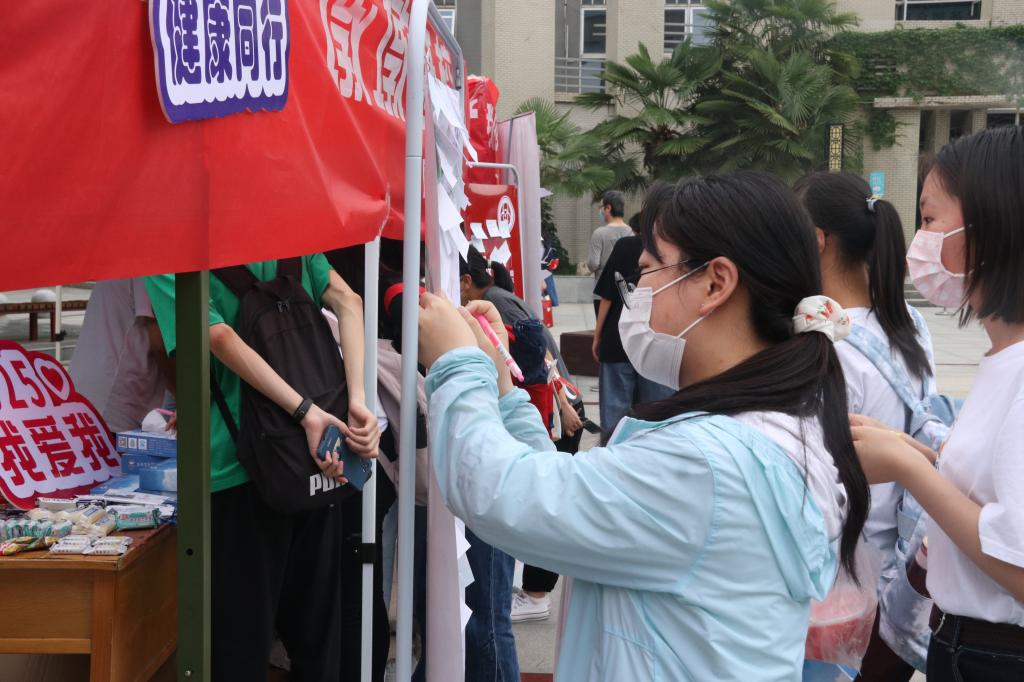 公司研究生化身“大白”和“墩墩”在阳光苑广场与师生相遇,通过主动打招呼、互动拥抱、赠送活动纪念书签、卡片、小零食等形式,与参与师生展开互动,为大家送去温暖与祝福。有些同学一开始虽然略有害羞,但是在“大白”和“墩墩”的热情邀请下也积极参与其中,部分同学还在活动心愿墙上写下了“关爱自己”的寄语。