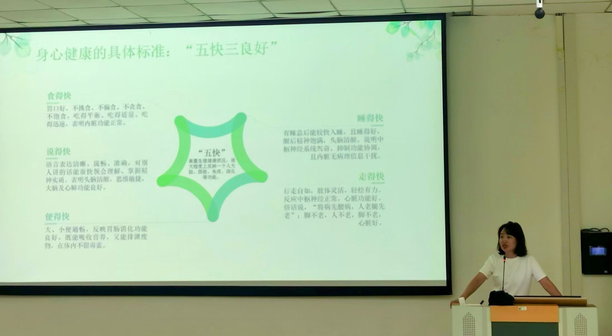 周全丽以“研途‘心’生活的通关保障”为主题,结合相关案例,从健康的身体和良好的心态方面入手,帮助同学们理解身心健康的重要性。首先,她指出了衡量身心健康的具体标准——“五快三良好”。接着,她分别从身体和心理两个角度分享了积极调适身心的方法,详细介绍了冰山理论、聚光灯效应等知识和情绪急救SOS方法,鼓励同学们要保持对生理不适的觉知,并希望同学们积极面对情绪、合理看待情绪和理解放下情绪。最后,周全丽提出了处理人际关系、增进相互理解的宝贵指南即尊重、真诚和共情,她希望同学们在日常学习生活中要掌握好观察、感受、需要、请求等能有效沟通的四步法。