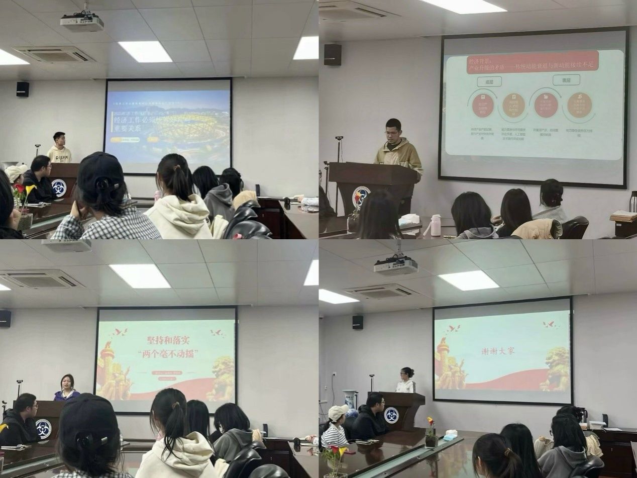 张博超同志和乔陈玉辉同志领学了习近平总书记重要文章《经济工作必须统筹好几对重要关系》。两位同志分别围绕“有效市场与有为政府”和“做优增量与盘活存量”两对重要关系,结合相关专业知识进行深入浅出的分享。邵逸冰同志和张晗玥同志领学了习近平总书记重要文章《坚持和落实“两个毫不动摇”》。两位同志从“毫不动摇地巩固和发展公有制经济”以及“毫不动摇地鼓励、支持和引导非公有制经济”两个方面出发,分享了坚持和落实“两个毫不动摇”的具体措施和发展实例。