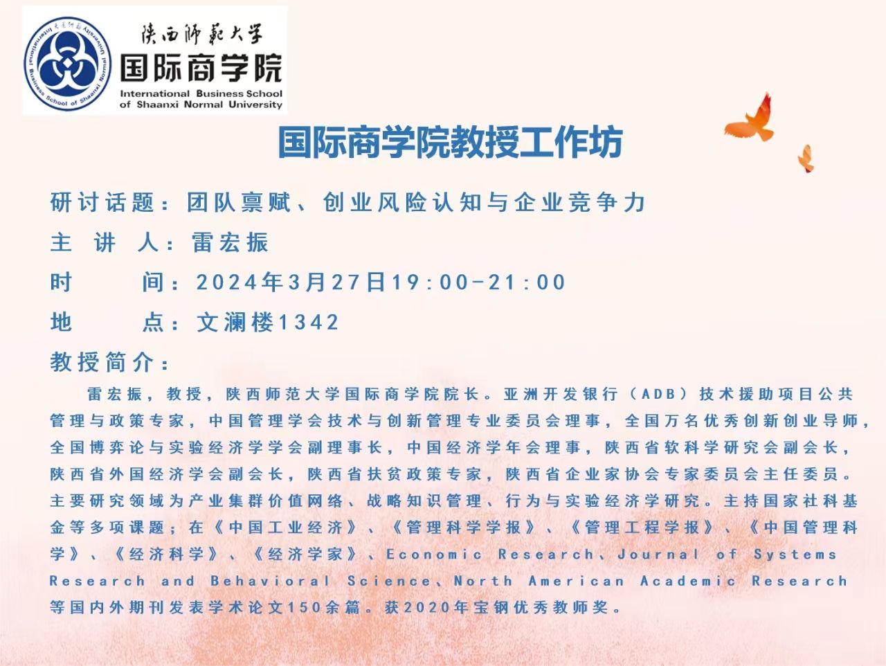 tyc41183太阳成教授工作坊——团队禀赋、创业风险认知与企业竞争力