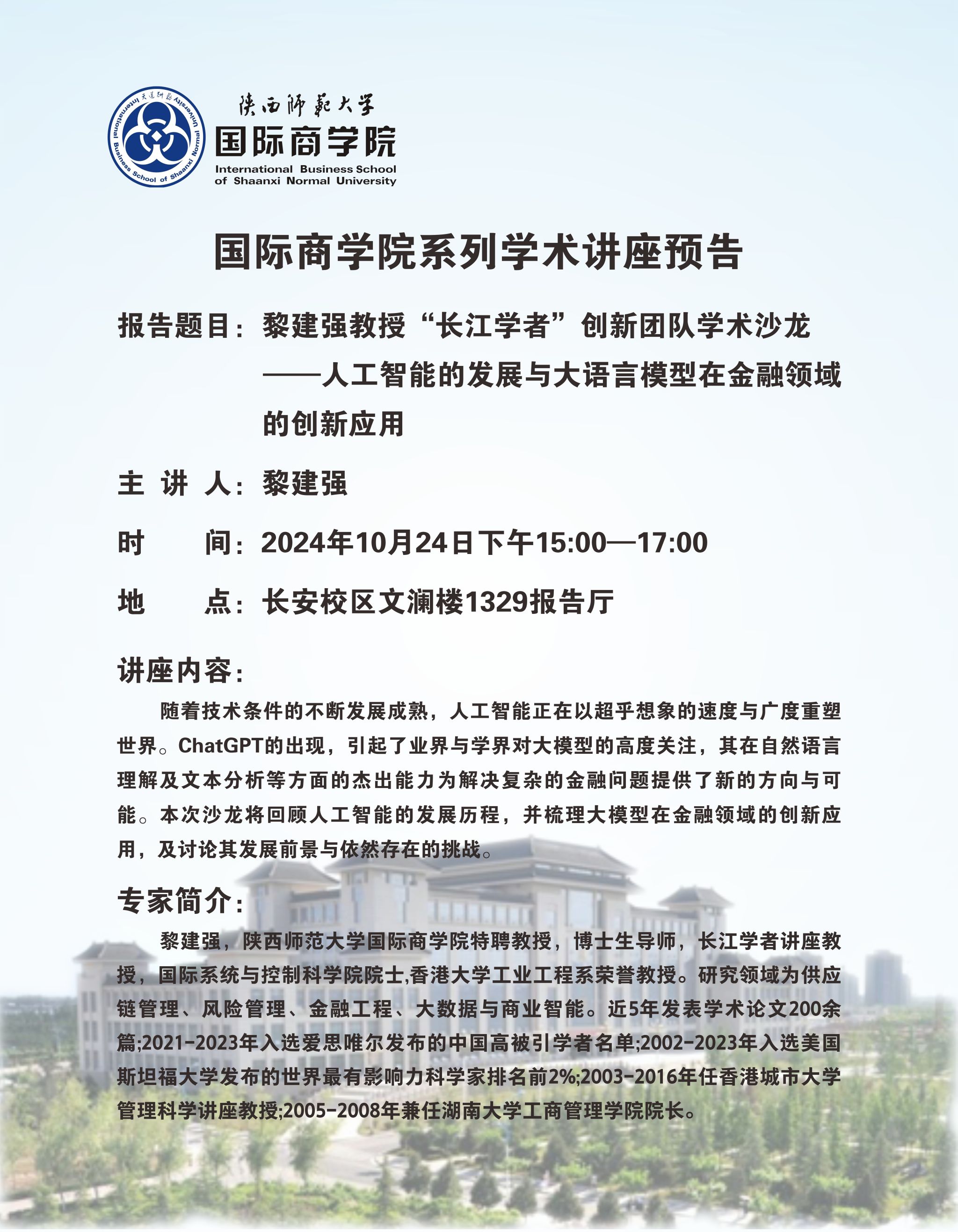 学术讲座预告——黎建强教授“长江学者”创新团队学术沙龙——人工智能的发展与大语言模型在金融领域的创新应用