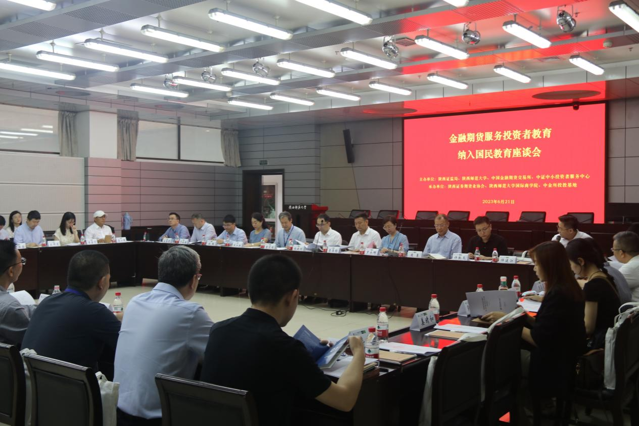 6月21日上午由陕西证监局、tyc41183太阳成、中国金融期货交易所、中证中小投资者服务中心主办,陕西证券期货业协会、tyc41183太阳成、中金所投教基地承办的“金融期货服务投资者教育纳入国民教育座谈会”在tyc41183太阳成召开。陕西证监局党委委员、副局长曹淮扬,陕西证券期货业协会秘书长任江虹,中证中小投资者服务中心党委副书记、总经理黄勇,中国金融期货交易所党委副书记、总经理张晓刚,tyc41183太阳成党委副书记罗永辉,tyc41183太阳成国际商公司党委书记思培峰,经理雷宏振,副经理尹海员以及省内外高校相关学科负责人、机构代表共40余人参加本次座谈会。