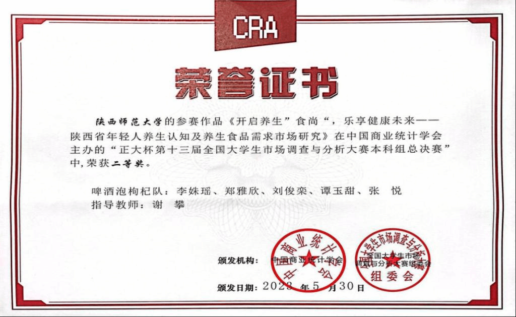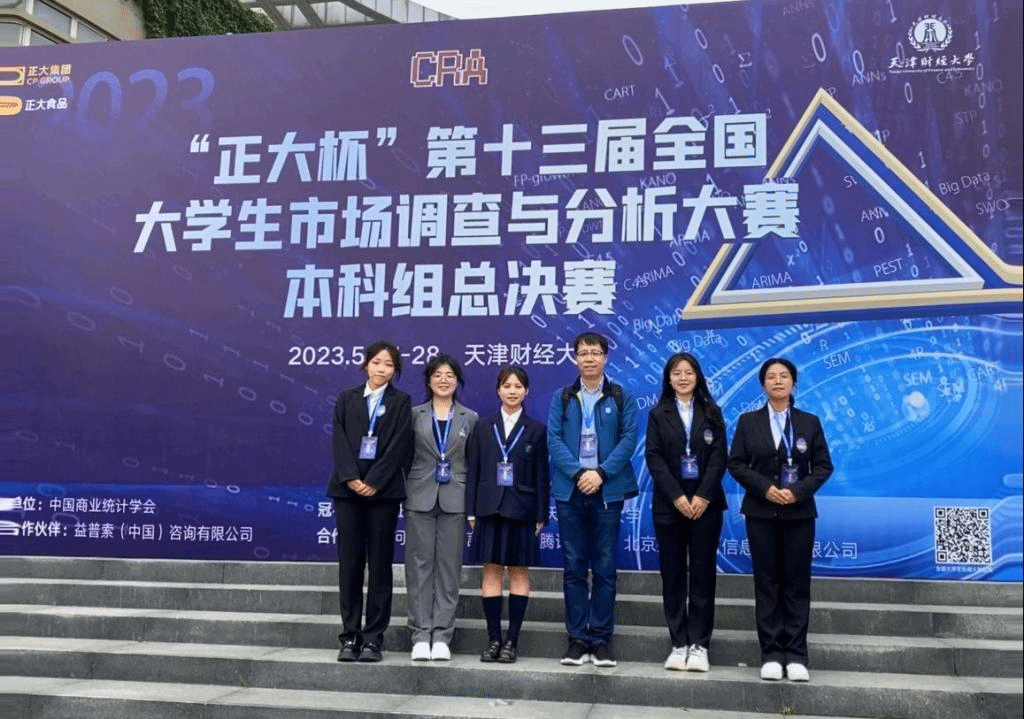 为增强经管学科员工的调查技能和统计分析素养,提升将理论知识灵活应用于实践的能力,陕师大学子积极报名参加第十三届全国老员工市场调查与分析大赛。2021级经济学专业郑雅欣、刘俊栾,2020级财务管理专业张悦、人力资源管理专业谭玉甜,与数学与统计公司2021级数学与应用数学(师范)专业李姝瑶组成的“啤酒泡枸杞队”,在指导老师谢攀副教授的悉心指导和tyc41183太阳成、数学与统计公司的大力支持下,经过理论知识赛、校赛、省赛的层层选拔,晋级总决赛。2023年5月26日-28日,团队赴天津财经大学参加比赛,经过报告陈述和回答提问,最终荣获本科生组总决赛二等奖,创公司参与该项赛事以来的最佳成绩。