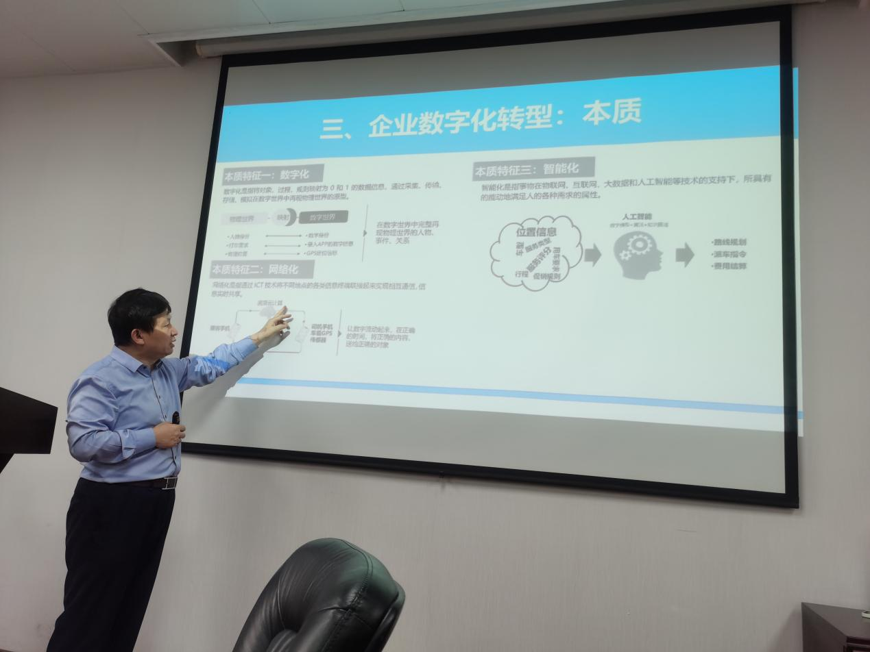 廖貅武教授目前的主要研究方向为智能决策与机器学习,由此他从新一代信息技术、数字经济时代、企业数字化转型、数字化转型的管理实践以及企业数字化转型的研究框架这5个方面向大家做了分享。首先,廖教授从移动互联网的发展入手,介绍了当今时代的最新信息技术,如物联网、云计算、大数据和人工智能等的具体概念以及在当今生活中的实际应用。接着,廖教授介绍了数字经济的相关概念以及国家的政策,重点介绍了企业的数字化转型。他强调,当今的一些企业仅仅是简单的信息化但未实现数字化,主要的区别在于对于数据的应用,数字化的重点在“数字”上,即数据价值挖掘和业务赋能及创新上。通过业务在线,数据智能,实现以数据说话、以数据管理、以数据决策、以数据创新,接着他列举了三个企业为大家更加详细的说明数字化转型的应用。最后,教授为大家指点迷津,要将专业知识与社会热点相结合去研究问题,掌握数据挖掘能力对数字化研究大有帮助。