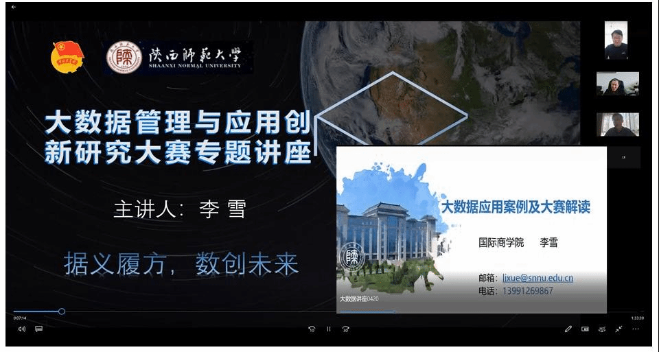 李雪副教授从大数据是什么、大数据有哪些应用案例、大数据分析应遵循什么样的分析过程以及此次比赛的要求等方面作了报告。报告中列举了一系列大数据应用领域的成功案例,并对本次竞赛的主题、赛道等进行了解读,使同学们对大数据产生了更多的理解和兴趣。