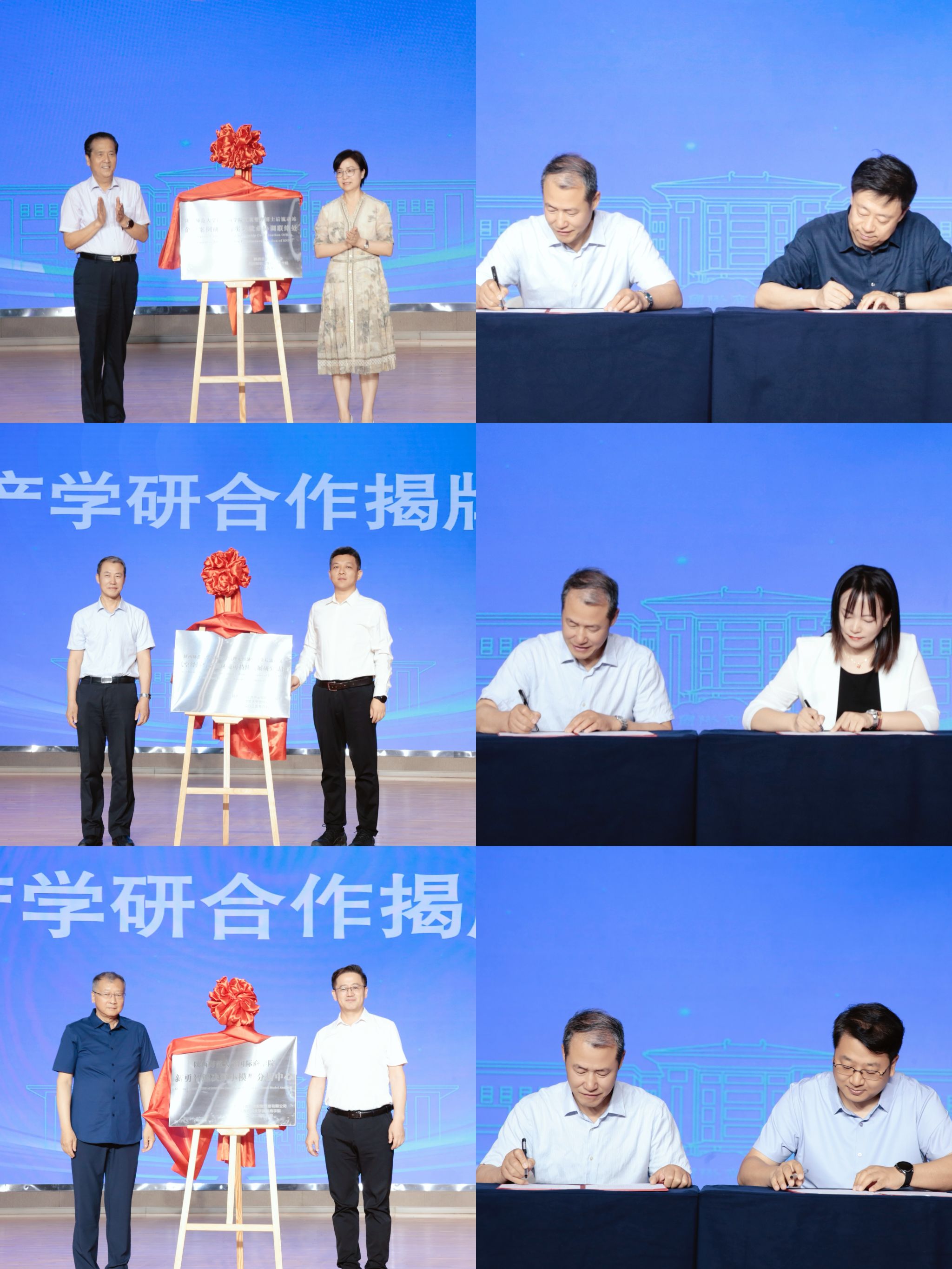 产学研合作揭牌仪式上,罗永辉与陕西省企业家协会会长段克明揭牌了“tyc41183太阳成工商管理博士后流动站企业案例研究与实习就业协调联络处”;公司经理雷宏振与陕西未来经济产业控股有限公司总经理付明磊揭牌了“tyc41183太阳成理论经济学博士后流动站低空经济与资源环境可持续发展研究基地”;思培峰与上海众合创业投资管理有限公司董事长聂新勇揭牌了“tyc41183太阳成新勇智能决策小模型分析中心”。