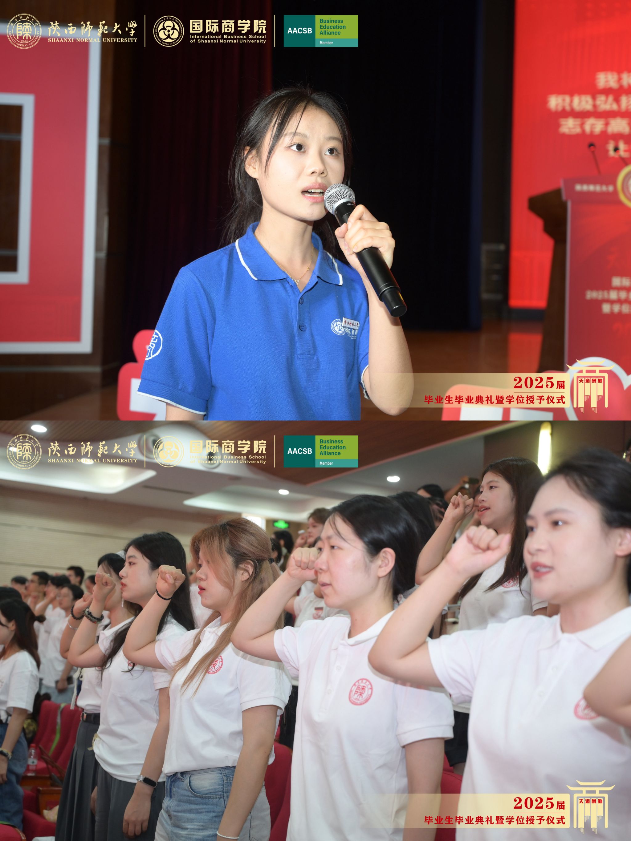在本科毕业生代表贾文佳的带领下,全体学子庄严宣誓,誓言践行使命、不负韶华。公司学位评定委员会成员为毕业生扶正流苏、授予学位,为这段求学岁月画上圆满句号。