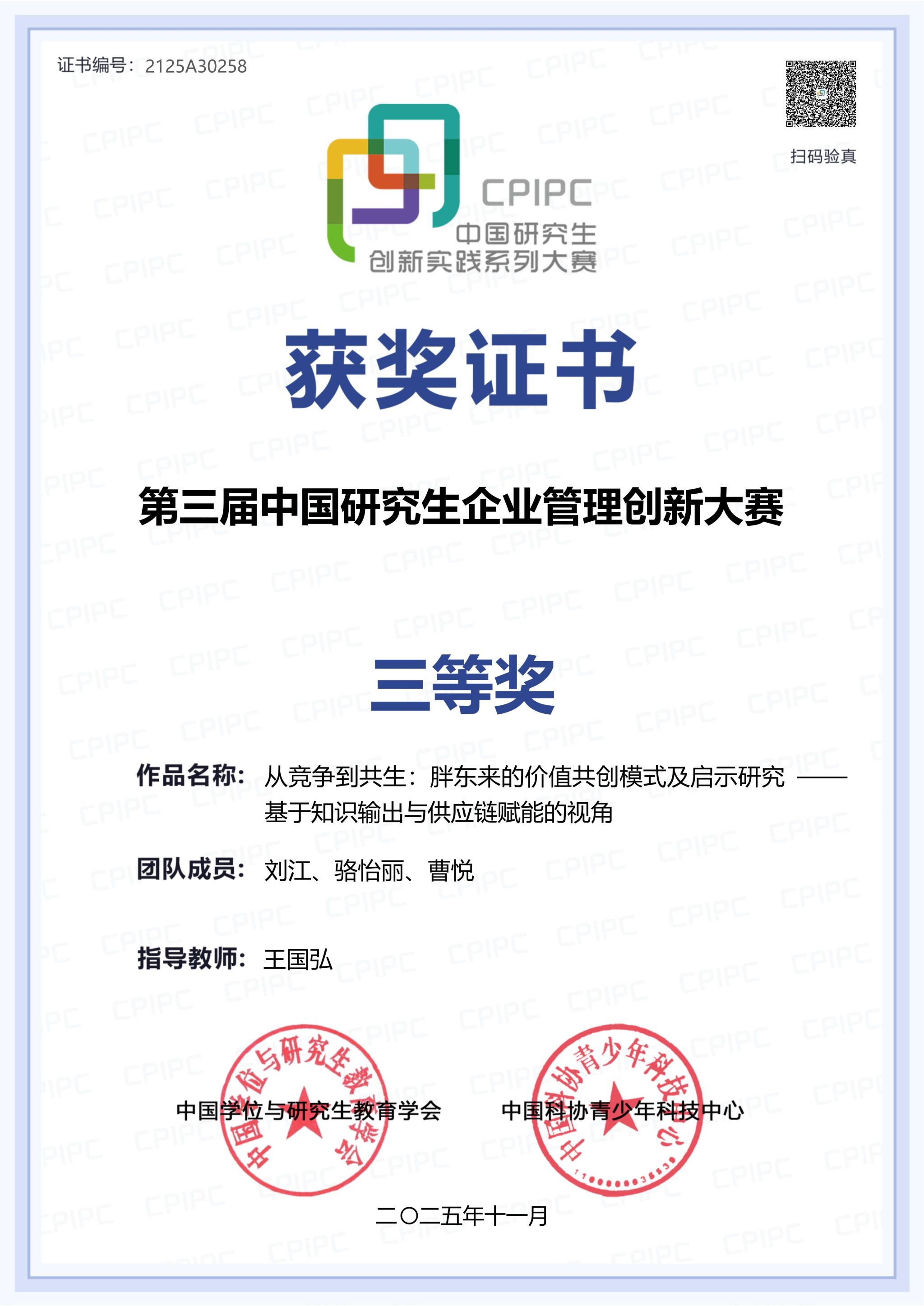 近日,第三届(2025)中国研究生企业管理创新大赛全国总决赛圆满收官,由公司教师王国弘指导,2025级MBA研究生刘江、骆怡丽、曹悦组成的“联创金兰”团队在工商管理案例赛道斩获全国三等奖,成为公司在该全国性赛事中的首支获奖队伍,刷新了最好成绩。