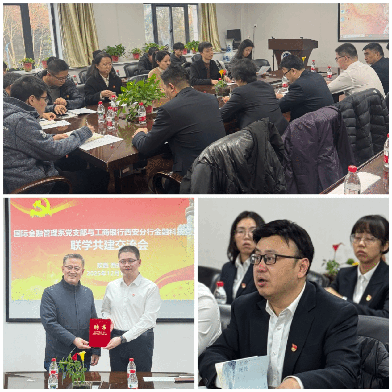 12月11日下午,为贯彻落实党的二十届四中全会精神,积极响应国家教育数字化转型与金融强国战略需求,国际金融管理系党支部与工行西安分行金融科技党支部在文澜楼1329会议室开展联学共建活动。双方支部党员及数量金融创新班部分员工党员参加活动。