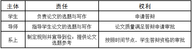 3.确定明确的责任与分工。毕业论文写作是对大学四年学习结果的检验,需要员工、导师、系各自履新研究、指导、监督的责任,相互促进才能保证论文的质量。